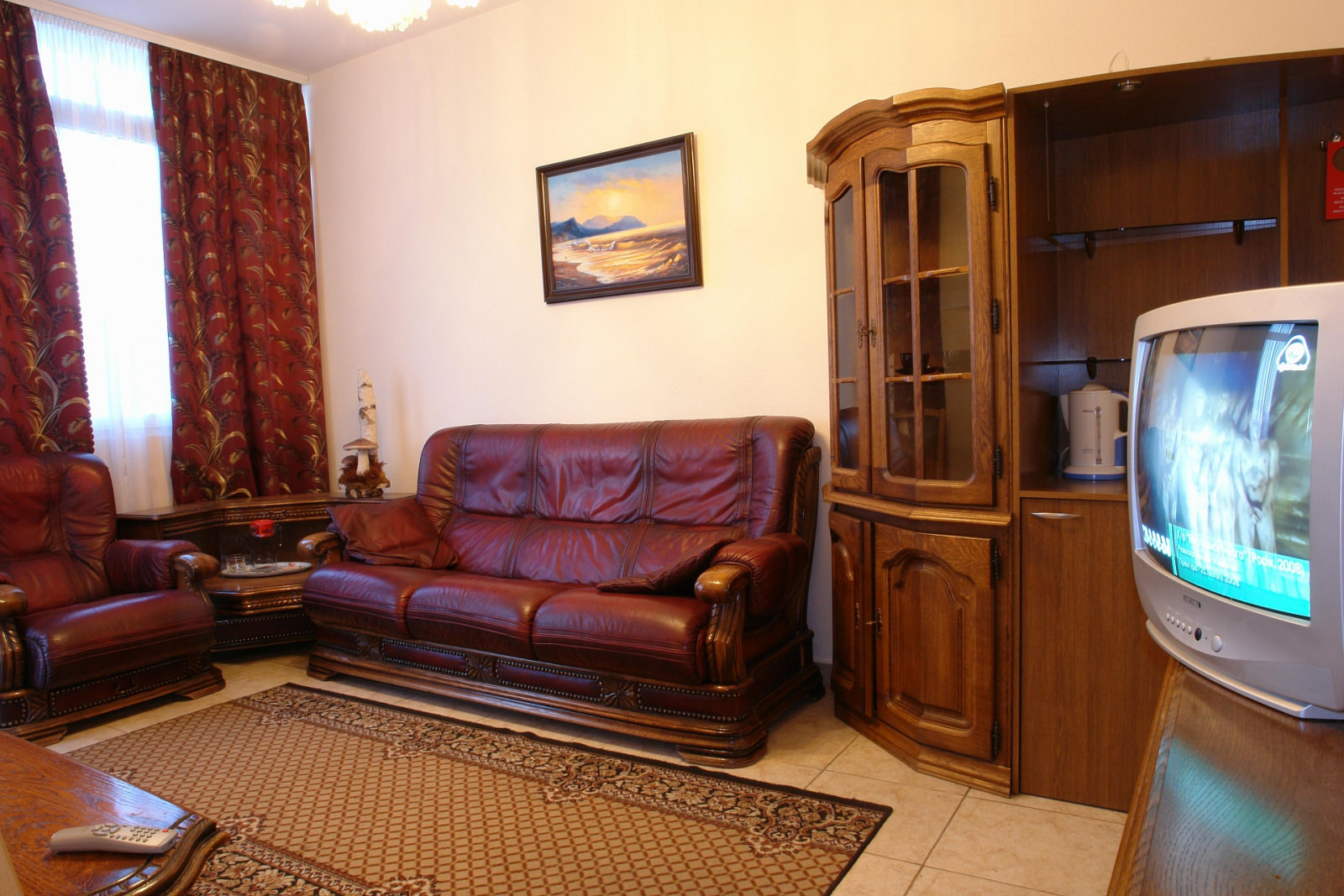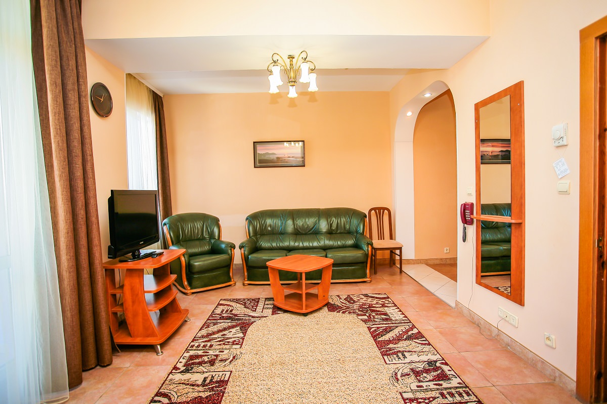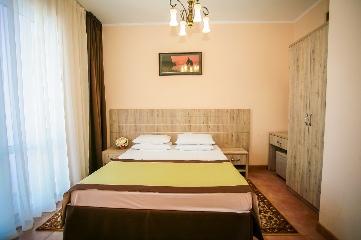 Площадь номера - 47 кв.м. 3 осн. места. 1 доп. место. Балкон. Мебель: вешалка, диван раскладной, зеркало, кресло, кровать двуспальная, набор мягкой мебели, прикроватные тумбочки, стол, шкаф. Оборудование: кондиционер, набор посуды, телевизор, холодильник, электрочайник. Санузел: с душевой кабиной, туалетные принадлежности, фен. Сервис: смена полотенец (ежедневно), смена постельного белья (1 раз в 5 дней), уборка номера (ежедневно).