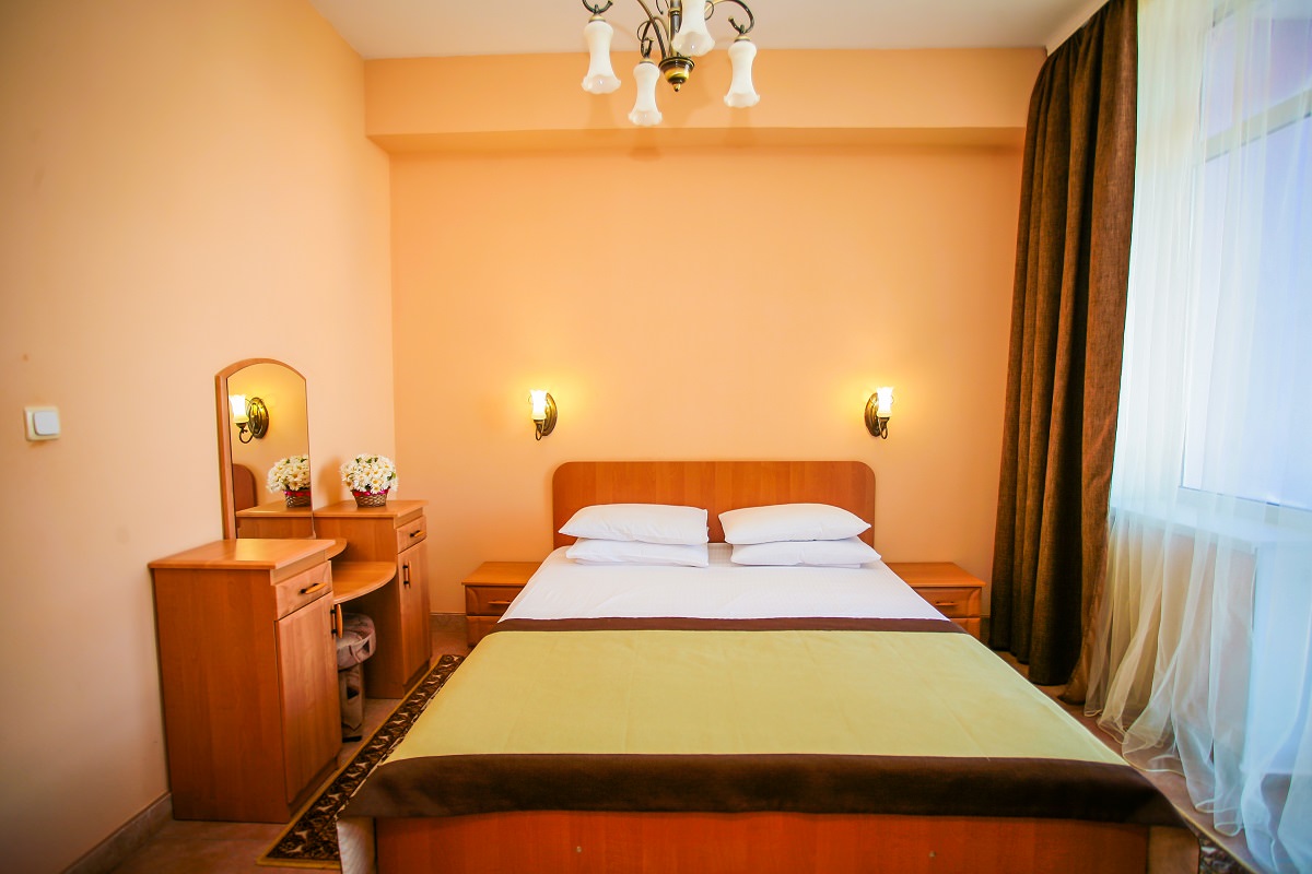 Площадь номера - 32 кв.м. 3 осн. места. 1 доп. место. Балкон. Мебель: вешалка, диван, зеркало, кресло-кровать, кровати односпальные, прикроватные тумбочки, стол, стул, шкаф. Оборудование: набор посуды, система общего кондиционирования, телевизор, холодильник. Санузел: с душем (поддон), туалетные принадлежности. Сервис: смена полотенец (ежедневно), смена постельного белья (1 раз в 5 дней), уборка номера (ежедневно).
